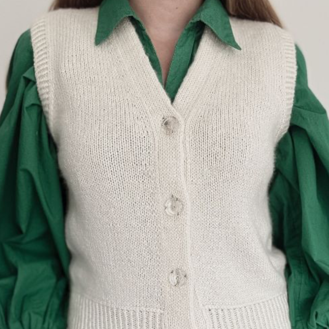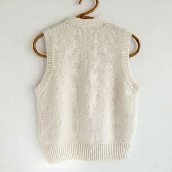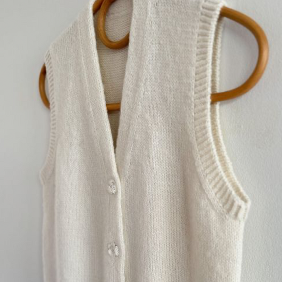 A Knitters Vest er en skøn lun vest fuld af lækre detaljer. Sværhedsgraden er medium. Den har en masse glatstrik og rib, men også smukke detaljer som vandrette masker og lodret knapstolpe - Alt beskrives rigtigt fint i opskriften!