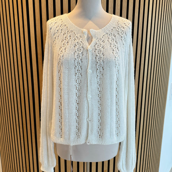Fnuglet cardigan, kort model med positiv bevægelsesfrihed og et nemt og feminint hul mønster. Skjoldmø er strikket oppefra og ned. Knapstolpen strikked med undervejs, så du slipper for montering.