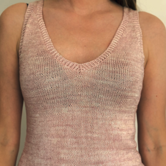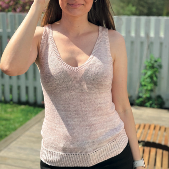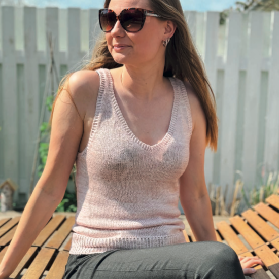 Dejlig let sommer top som bliver strikket i 100% Silke. Den bliver strikket oppefra og ned og er monteringsfri. Nemt begynder projekt. Farven på den rosa top på billedet er Cherry Blossom.