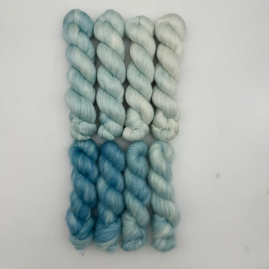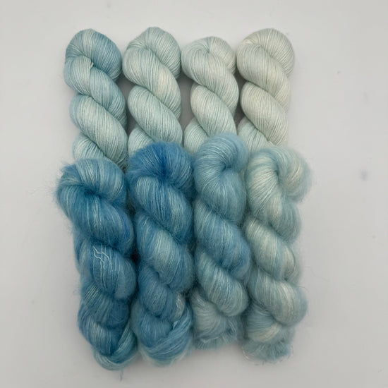 Fade sæt bestående af 4 fed Merino/ Silke og 4 fed Mohair Sport, som hver indeholder følgende: